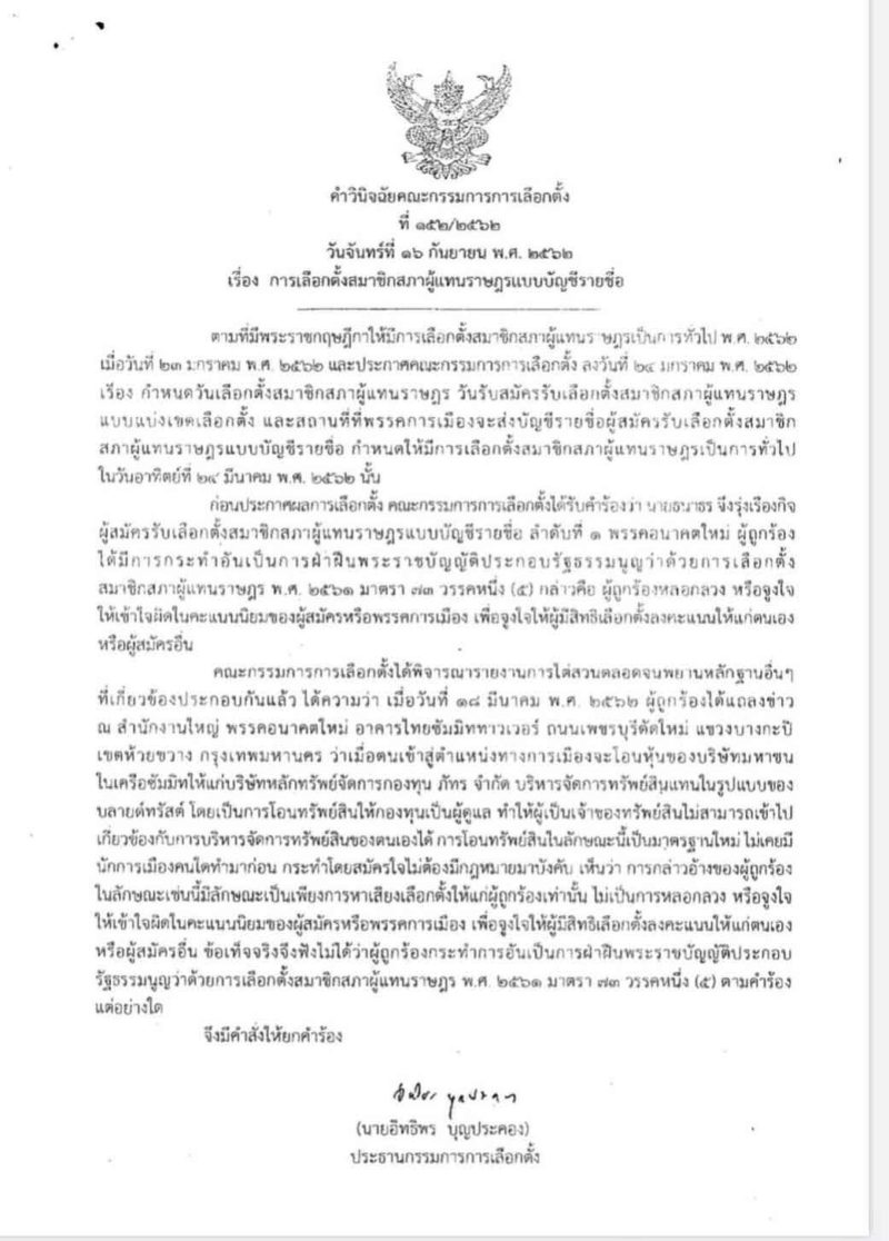เว็บไซต์สำนักงานคณะกรรมการการเลือกตั้ง (กกต.) เผยแพร่คำวินิจฉัย โดยนายอิทธิพร บุญประคอง ประธานคณะกกต. เป็นผู้ลงนาม เมื่อวันที่ 16 ก.ย. ซึ่งเป็นคำสั่งยกคำร้องของ นายศรีสุวรรณ จรรยา เลขาธิการสมาคมองค์การพิทักษ์รัฐธรรมนูญไทย ที่ขอให้วินิจฉัยกรณี ที่นายธนาธร จึงรุ่งเรืองกิจ หัวหน้าพรรคอนาคตใหม่ แถลงข่าวเรื่อง แนวทางการจัดการทรัพย์สินในการเข้าสู่ตำแหน่งทางการเมืองโดยใช้แนวทางบลายด์ทรัสต์ ว่าเข้าข่ายความผิดมาตรา 73 (5) ของกฎหมายว่าด้วยการเลือกตั้ง ส.ส.หรือไม่ หรือเป็นการเข้าข่ายหลอกลวง หรือจูงใจให้เข้าใจผิดในคะแนนนิยมของผู้สมัครหรือพรรคการเมือง