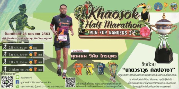 วิ่งไปบนเส้นทางสายหมอกยามเช้า เพื่อการกุศล “Khao Sok Halfmarathon” Run for rangers 3 วิ่งเพื่อผู้พิทักษ์ป่า ครั้งที่ 3 รายได้หลังหักค่าใช้จ่ายร่วมสมทบกองทุน “มูลนิธิผู้พิทักษ์ป่า” เพื่อช่วยเหลือเจ้าหน้าที่พิทักษ์ป่าที่ได้รับบาดเจ็บหรือเสียชีวิตจากการทำหน้าที่ปกป้องทรัพยากรป่าไม้ของชาติ