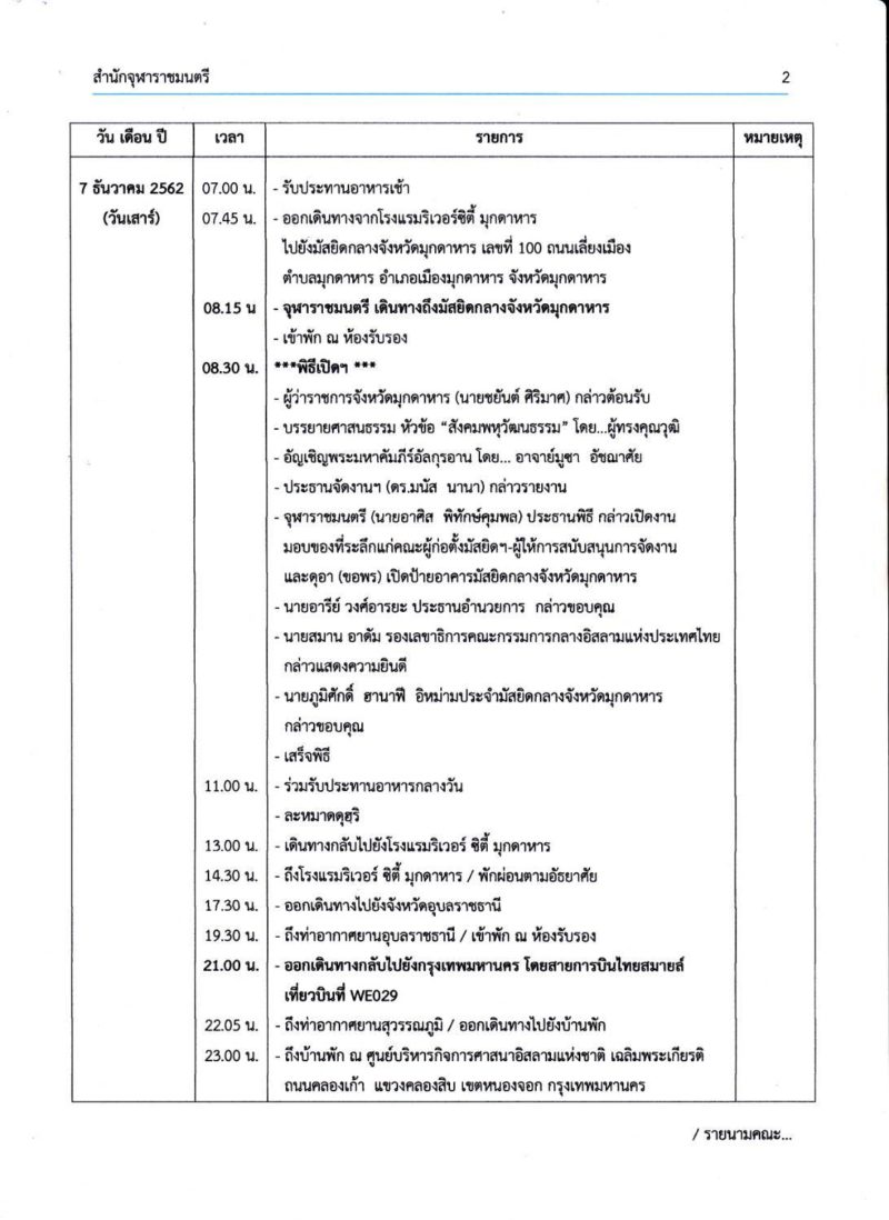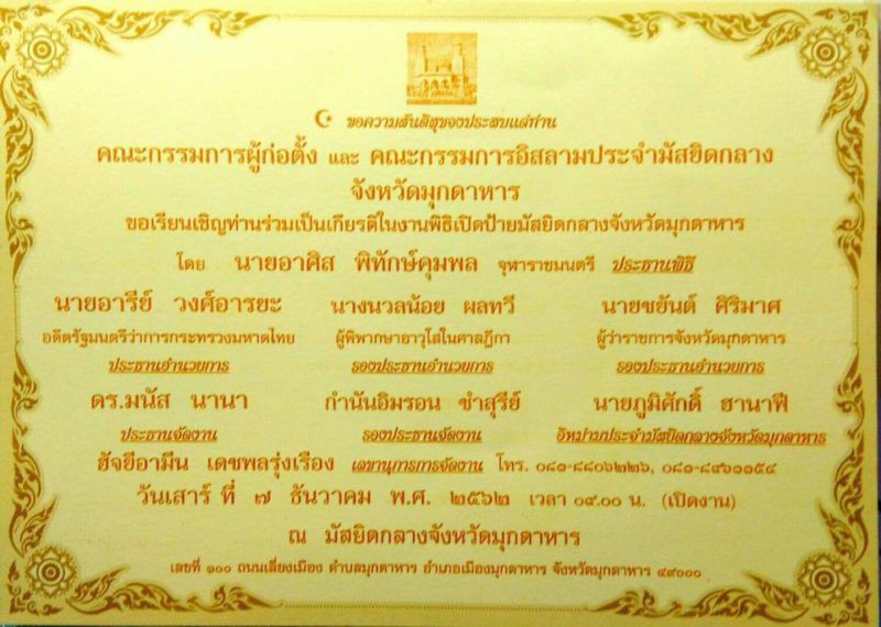 ในพิธีเปิดป้ายมัสยิดกลางมุกดาหาร มีนายอาศิส พิทักษ์คุมพล จุฬาราชมนตรี เป็นประธาน มีนายมนัส นานา เป็นประธานจัดงาน