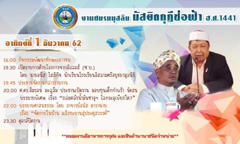 นอกจากนี้ ดร.อิมรอน มะลูลีม บรรยายพิเศษ ถล่มคลังน้ำมันซาอุฯ โลกระอุเพียงใด อ.อนัส ดาราฉาย บรรยายธรรม การจัดการในบ้าน และทะยานสู่ประตูสวรรค์