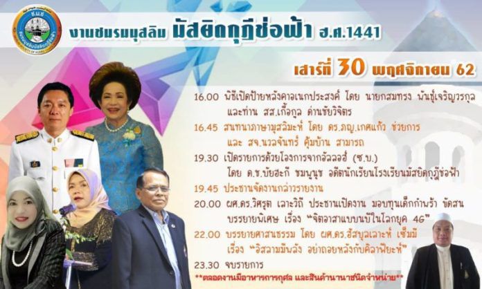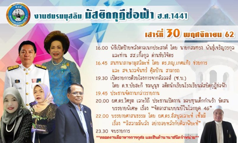 งานชมรมมัสยิดกุฎีช่อฟ้า ฮ.ศ.1441 จัดขึ้นระหว่างวันที่ 30 พ.ย.-1 ธ.ค. 2562 รายได้เพื่อมัสยิดกุฎีช่อฟ้า ภายในงานมีการบรรยายธรรมของบรรดาผู้ทรงคุณวุฒิ ทั้งมุสลิมีนและมุสลิมะห์มากมาย