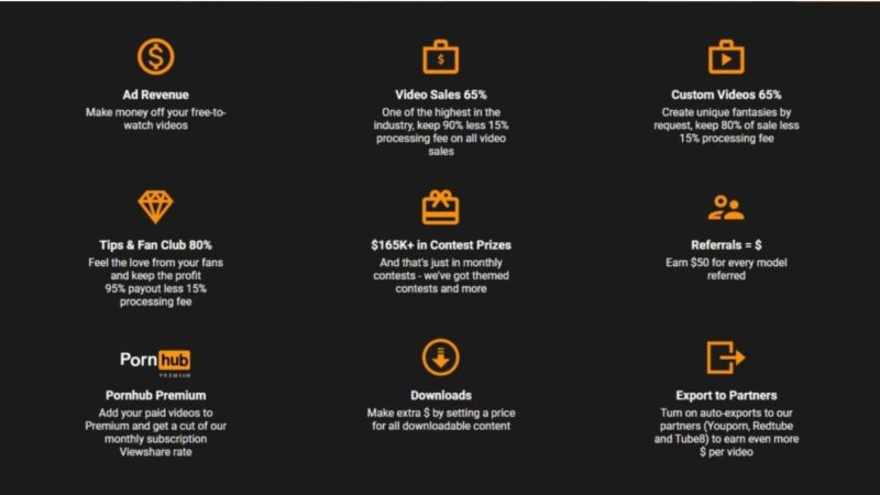 ซึ่งทางเว็บไซต์ Pornhub ที่สร้างรายได้จากการเก็บค่าโฆษณาบนหน้าเว็บอยู่แล้ว ก็ได้มีการเปิดฟีเจอร์ “สร้างรายได้” ซึ่งก็คือ Pornhub จะแบ่งส่วนแบ่งรายได้จากการโฆษณาให้แก่เจ้าของคลิปวิดีโอที่อัปโหลดอยู่บนเว็บไซต์ พูดง่ายๆ คุณอัปโหลดวิดีโอลง Pornhub – Pornhub แปะโฆษณาลงวิดีโอของคุณ – คุณได้ค่าส่วนแบ่งจาก Pornhub