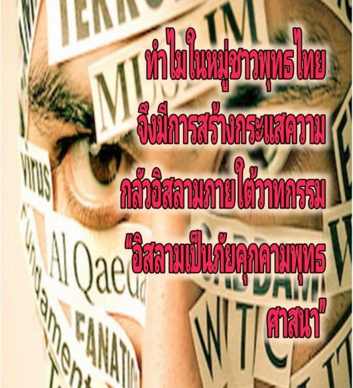 ภัยคุกคามที่จะสร้างขึ้นและชี้ให้เห็นได้ง่ายที่สุดคืออิสลาม โดยอ้างอิงปัญหา 3 จังหวัดภาคใต้ และอาจโยงกับกระแสต้านมุสลิมในพม่า ศรีลังกา หรืออ้างอคติระดับสากล แต่ไม่มีความเกี่ยวพันกันเป็นขบวนการแต่อย่างใด เป็นเรื่องส่วนบุคคลของพระหรือชาวพุทธบางกลุ่มที่พยายามสร้างกระแสปกป้องพุทธศาสนาขึ้นมาเพื่อเป้าหมายบางอย่างมากกว่า