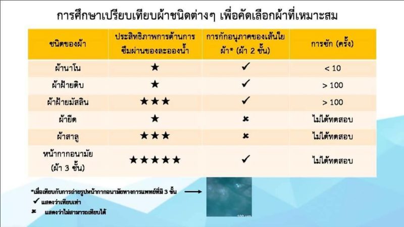 กรมวิทยาศาสตร์การแพทย์ สธ.เผยผลทดสอบ วัสดุที่ควรนำมาผลิต “หน้ากากอนามัย” พบ “ฝ้ายมัสลิน” เหมาะสมใช้เป็น มากที่สุด และ สามารถทำความสะอาด ซักล้างและตากแห้งได้ทุกวัน
