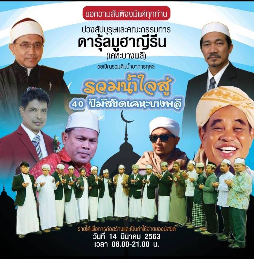 ขอเชิญร่วมดื่มน้ำชาการกุศล งาน“รวมน้ำใจสู่ 40ปีมัสยิดเคหะบางพลี(ดารุ้ลมูฮาญีรีน) เพื่อหารายได้ก่อสร้างมัสยิดที่ยังคั่งค้าง พบการบรรยายธรรมของอาจารย์ชื่อดัง และอาหารคาวหวานมากกว่า 30 เมนู