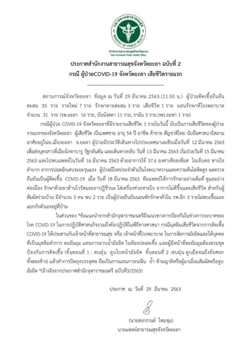 ยะลาเสียชีวิตรายแรก ติดเชื้อรวม 35 คน ผู้เสียชีวิตชาวยะลา มีประวัติกลับมาจากส่งลูกไปสาวไปโกตาบารู ไม่เกี่ยวกับการเข้าร่วมพิธีทางศาสนา มีโรคประจำตัวตัวเบาหวานและความดัน จัดการศพตามประกาศสำนักจุฬาราชมนตรี ให้ตะยัมมุม แทนการอาบน้ำศพ