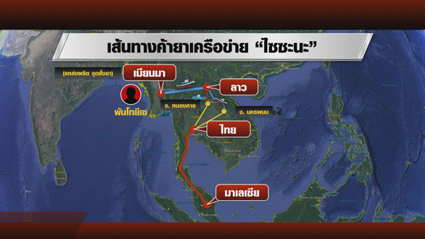จากกลุ่มบุคคลและเครือข่ายค้ายาที่มีนายไซซะนะเป็นหัวหน้าใหญ่ จะเห็นได้ว่าเขาใช้เส้นทางภาคอีสานของไทยเป็นจุดรับยาจากฝั่งลาว จากนั้นจึงเคลื่อนย้ายเข้าสู่ภาคกลาง และขนลงภาคใต้