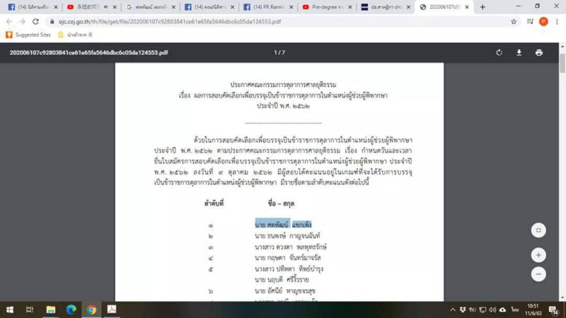 โดยคณะกรรมการตุลาการศาลยุติธรรม ได้ออกประกาศ เรื่อง ผลการสอบคัดเลือกเพื่อบรรจุเป็นข้าราชการตุลาการในตำแหน่งผู้ช่วยผู้พิพากษาประจำปี พ.ศ.2562 มีผู้สอบได้คะแนนอยู่ในเกณฑ์ที่จะได้รับการบรรจุเป็นข้าราชการตุลาการในตำแหน่งผู้ช่วยผู้พิพากษา 171 ราย 75 ลำดับ