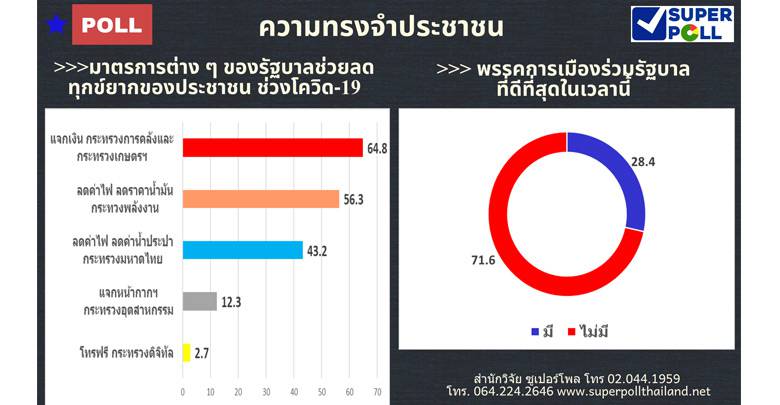 ซูเปอร์โพล ระบุ ปชช. ส่วนใหญ่ไม่ได้ดูนายกฯ ออกทีวีชี้แจงฟื้นฟูโควิด แต่ยังเชื่อมั่นและศรัทธา การทำงานของรัฐบาล โดยเฉพาะมาตรการของ ก.คลัง-เกษตรฯมากที่สุด ส่วนประเด็นการเมือง พบว่า ส่วนใหญ่ 71.6% บอกไม่มีพรรคร่วมรัฐบาลที่ดีในตอนนี้