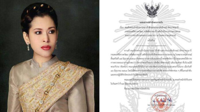 ตามที่ สมเด็จพระเจ้าน้องนางเธอ เจ้าฟ้าจุฬาภรณวสัยลักษณ์ อัครราชกุมารี กรมพระศรีสวางควัฒน วรขัตติยราชนารี เสด็จไปประทับรักษาพระอาการประชวร ณ โรงพยาบาลจุฬาภรณ์ ตั้งแต่วันที่ 15 มิถุนายน 2563 ด้วยพระอาการชาบริเวณปลายนิ้วพระหัตถ์ขวา นั้น คณะแพทย์ได้ถวาย การตรวจพระอาการแล้วพบว่า เกิดจากพระกิโลมกะ (พังผืด) รัดพระรมนี (เส้นประสาท) ที่บริเวณใต้ พระกัประ (ข้อศอก) คณะแพทย์จึงได้ถวายการผ่าตัดผ่านกล้องเลาะแผ่นพระกิโลมกะ เมื่อวันที่ 16 มิถุนายน 2563 โดยไม่มีพระอาการแทรกซ้อนจากการผ่าตัด พระอาการชาค่อย ๆ ดีขึ้นตามลำดับและทรงปฏิบัติกิจวัตรประจำวันได้ตามปกติแล้ว