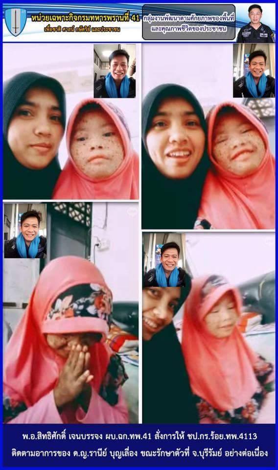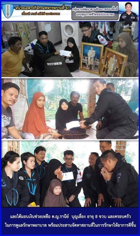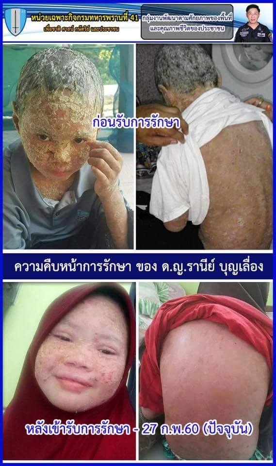 เมื่อ 27 ม.ค.60 ความคืบหน้า ตามที่ Mtoday ได้นำเสนอข่าวและเรียกร้องให้ร่วมกันบริจาคเพื่อช่วยเหลือ ด.ญ.รานีย์ บุญเลื่อง อายุ 8 ขวบ อาศัยอยู่บ้านเลขที่ 99/5 ม.2 ต.วังพญา อ.รามัน จ.ยะลา ป่วยเป็นโรคสะเก็ดเงินทั่วร่างกาย (100 เปอร์เซ็นต์) ได้รับความลำบากในการใช้ชีวิตประจำวันเป็นอย่างมาก ทำให้ได้รับความสนใจจากผู้มีจิตศรัทธาร่วมช่วยเหลือจำนวนมาก ขณะเดียวกัน พ.อ.สิทธิศักดิ์ เจนบรรจง ผบ.ฉก.ทพ.41 ซึ่งได้รับข่าวสาร จึงได้ประสานการปฏิบัติร่วมกับส่วนราชการและหน่วยงานในพื้นที่เข้าให้การช่วยเหลือ พร้อมสั่งการให้ ร้อย.ทพ.4113 จัด ชป.กร. เข้าพบปะ ติดตาม ดูแลอาการและให้ความช่วยเหลือ อย่างต่อเนื่อง หลังการรักษาที่ได้รับ ไม่ทำให้อาการดีขึ้น ทางครอบครัวจึงมีความประสงค์เดินทางไปรักษาที่ จ.บุรีรัมย์ จากการแนะนำ