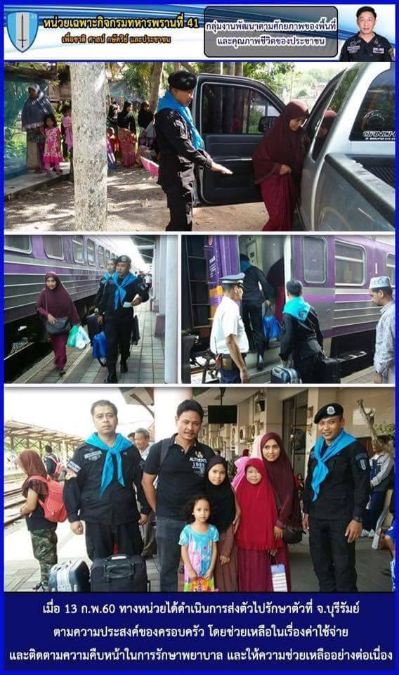 ต่อมาเมื่อ 13 ก.พ.60 ฉก.ทพ.41 จึงได้ส่งน้องและครอบครัวเดินทางไปรักษาตัวที่ จ.บุรีรัมย์ โดยพ.อ.สิทธิศักดิ์ เจนบรรจง ผบ.ฉก.ทพ.41 ได้ช่วยเหลือค่าใช้จ่ายในการเดินทางและค่าดูแลรักษาน้องทั้งหมด พร้อมทั้งติดตามผลการรักษาตั้งแต่วันส่งตัวจนถึงปัจจุบัน