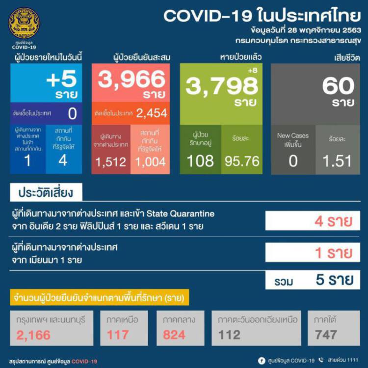 วันที่ 28 พ.ย.63 เฟซบุ๊กศูนย์ข้อมูล COVID-19 รายงานสถานการณ์การแพร่ระบาดของโรคติดเชื้อไวรัสโคโรนา 2019 หรือโควิด-19 ในประเทศไทย เวลา 11.00 น. สถานการณ์การติดเชื้อโควิด-19 มีผู้ป่วยรายใหม่ 5 ราย รวมสะสม 3,966 ราย แบ่งเป็นการติดเชื้อในประเทศ 2,454 ราย และเป็นผู้เดินทางมาจากต่างประเทศ 1,512 ราย รักษาหายป่วยแล้ว 3,798 ราย ยังรักษาอยู่ในโรงพยาบาล (รพ.) 108 ราย เสียชีวิตสะสม 60 ราย ทั้งนี้ในจำนวนผู้ป่วยสะสม 3,966 ราย รับรักษาในกรุงเทพมหานคร (กทม.) และนนทบุรีจำนวน 2,166 ราย ภาคเหนือ 117 ราย ภาคกลาง 824 ราย ภาคตะวันออกเฉียงเหนือ 112 ราย ภาคใต้ 747 ราย