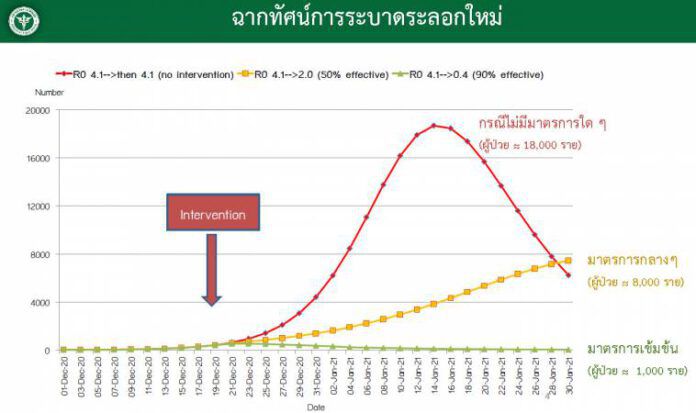 โฆษกศบค.ยังกล่าวถึง ฉากทัศน์ของการระบาดรอบใหม่ว่า วันนี้เอากราฟมาทำความเข้าใจ ทีมทำงานด้านระบาดวิทยา ของกรมควบคุมโรค เสนอฉากทัศน์ขึ้นมา 3 รูปแบบ รูปแบบที่ 1 หากไม่ทำอะไรเลย จนถึงวันที่ 14 ม.ค.โดยประมาณ คนไข้ที่จะมีเพิ่มขึ้นต่อวันมากถึง 18,000 ราย ถ้าเรามีมาตรการกลางๆ ขณะนี้กำลังทำอยู่ ก็จะมีผู้ป่วยเกือบๆ 4 พันรายต่อวัน ถ้าเราทำมาตรการเข้มข้น จะน้อยกว่า 1 พันรายต่อวัน “แนวโน้มขณะนี้เราอยู่ในเส้นสีส้ม ซึ่งเป็นเรื่องน่ากังวลใจ ซึ่งเส้นสีส้มทะแยงขึ้น 45 องศา มีผู้ป่วย 100 กว่ารายต่อวัน”