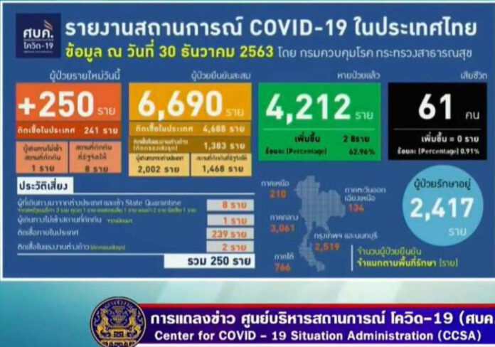 วันที่ 30 ธ.ค.63 ที่ ทำเนียบรัฐบาล เวลา11.30น. นพ.ทวีศิลป์ วิษณุโยธิน โฆษกศูนย์บริหารสถานการณ์โควิด-19 (ศบค.) แถลงสถานการณ์การแพร่ระบาดของไวรัสโควิด-19 ในประเทศวันนี้ว่า พบผู้ป่วยยืนยันติดเชื้อรายใหม่เพิ่ม 250 ราย เป็นผู้ติดเชื้อภายในประเทศ 241 ราย ค้นหาคัดกรองเชิงรุกแรงงานต่างด้าว 2 ราย ผู้เดินทางไม่เข้าสถานกักกันจากเมียนมา 1 ราย ส่วนผู้ที่เดินทางมาจากต่างประเทศและพบในสถานกักกันที่รัฐจัดให้ ทุกรายเข้าสถานกักกัน (State Quarantine) 8 ราย ประกอบด้วย สหรัฐอเมริกา 3 ราย คูเวต 1 ราย ออสเตรเลีย 1 ราย เคนย่า 2 ราย และรัสเซีย 1 ราย และวันนี้มีผู้ป่วยรักษาหาย 28 ราย