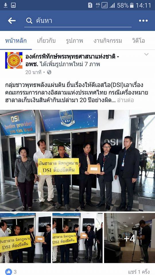 วันที่ 4 มีนาคม เพจองค์กรพิทักษ์พระพุทธศาสนาแห่งชาติ-อพช. ได้โพสต์รูปภาพและข้อความระบุว่า กลุ่มชาวพุทธพลังแผ่นดิน ยื่นเรื่องให้ดีเอสไอ(DSI)เอาเรื่องคณะกรรมการกลางอิสลามแห่งประเทศไทย กรณีเครื่องหมายฮาลาลเก็บเงินสินค้ากินเปล่ามา 20 ปีอย่างผิดกฎหมาย ตามคำวินิจฉัยผู้ตรวจการแผ่นดิน และสภาความมั่นแห่งชาติ