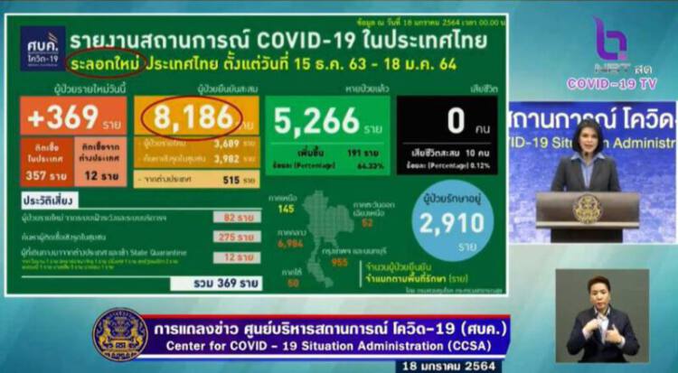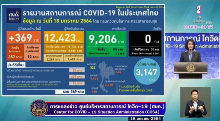 วันที่ 18 ม.ค.64 เวลา 11.30 น. ที่ทำเนียบรัฐบาล พญ.อภิสมัย ศรีรังสรรค์ ผู้ช่วยโฆษกศูนย์บริหารสถานการณ์โควิด-19 รายงานสถานการณ์การแพร่ระบาดของไวรัสโควิด-19 ในประเทศวันนี้ ว่า พบผู้ป่วยยืนยันติดเชื้อรายใหม่เพิ่ม 369 ราย เป็นผู้ติดเชื้อภายในประเทศ 357 ราย มาจากการตรวจในระบบเฝ้าระวังและบริการ 82 ราย จากการค้นหาคัดกรองเชิงรุกในชุมชน 275 ราย ส่วนใหญ่ในจังหวัดสมุทรสาคร และผู้ที่เดินทางมาจากต่างประเทศ โดยอยู่ในสถานกักกันที่รัฐจัดให้ (State Quarantine) 12 ราย ประกอบด้วย โอมาน 1 ราย สหราชอาณาจักร 1 ราย ฝรั้งเศส 1 ราย สหรัฐอเมริกา 2 ราย เยอรมนี 1 ราย มาเลเซีย 5 ราย และบาห์เรน 1 ราย ส่วนผู้ป่วยรักษาหายเพิ่มมีจำนวน 191 ราย