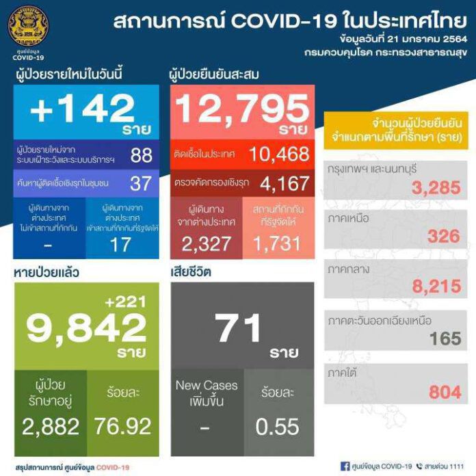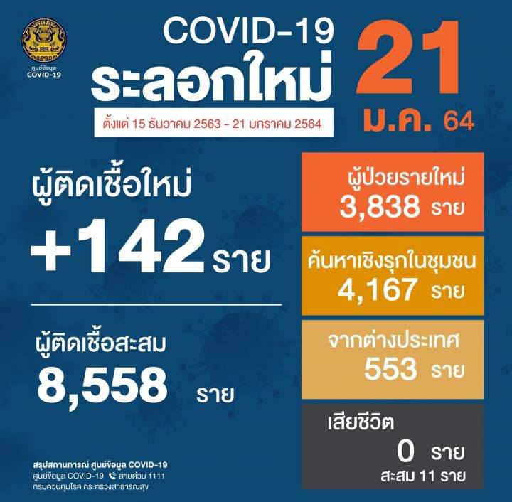 วันที่ 21 ม.ค.64 เวลา 11.30 น. ที่ทำเนียบรัฐบาล นพ.ทวีศิลป์ วิษณุโยธิน โฆษกศูนย์บริหารสถานการณ์โควิด-19 รายงานสถานการณ์การแพร่ระบาดของไวรัสโควิด-19 ในประเทศวันนี้ ว่า พบผู้ป่วยยืนยันติดเชื้อรายใหม่เพิ่ม 142 ราย เป็นผู้ติดเชื้อภายในประเทศ 125 ราย มาจากการตรวจในระบบเฝ้าระวังและบริการ 88 ราย จากการค้นหาคัดกรองเชิงรุกในชุมชน 37 ราย ส่วนใหญ่ในจังหวัดสมุทรสาคร และผู้ที่เดินทางมาจากต่างประเทศ โดยอยู่ในสถานกักกันที่รัฐจัดให้ (State Quarantine) 17 ราย ประกอบด้วย เมียนมา 2 ราย สวิตเซอร์แลนด์ 1 ราย สวีเดน 1 ราย ตุรกี 3 ราย ญี่ปุ่น 1 ราย อินเดีย 3 ราย สหรัฐอเมริกา 3 ราย มาเลเซีย 3 ราย ส่วนผู้ป่วยรักษาหายเพิ่มมีจำนวน 221 ราย