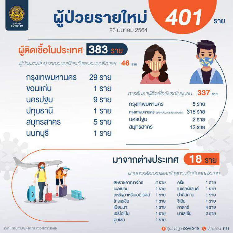 วันที่ 23 มี.ค.63 ศูนย์บริหารสถานการณ์โควิด-19 รายงานสถานการณ์การแพร่ระบาดของไวรัสโควิด-19 ในประเทศวันนี้ ว่า พบผู้ป่วยยืนยันติดเชื้อรายใหม่เพิ่ม 401 ราย เป็นผู้ติดเชื้อภายในประเทศ 383 ราย มาจากการตรวจในระบบเฝ้าระวังและบริการ 46 ราย จากการค้นหาคัดกรองเชิงรุกในชุมชน 337 ราย และผู้ที่เดินทางมาจากต่างประเทศ โดยอยู่ในสถานกักกันที่รัฐจัดให้ (State Quarantine) 18 ราย ผู้ป่วยรักษาหายแล้วเพิ่ม 103 ราย เสียชีวิตเพิ่ม 1 ราย เป็นชายวัย 75 ปี อยู่ในกรุงเทพมหานคร มีโรคประจำตัว ลิ้นหัวใจรั่ว ความดันโลหิตสูง และอัลไซเมอร์ เริ่มมีอาการไข้เมื่อ 14 มี.ค.เข้ารับการตรวจหาเชื้อโควิด-19 ยืนยันพบเชื้อ วันที่ 15 มี.ค.อาการแย่ลง และเสียชีวิตในวันที่ 19 มี.ค.64