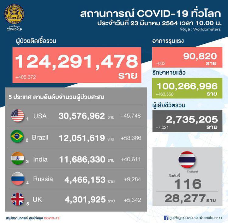 สถานการณ์โรคติดเชื้อไวรัสโคโรนา 2019 (COVID-19) ทั่วโลก วันอังคารที่ 23 มีนาคม 2564 เวลา 10.00 น. ยอดผู้ติดเชื้อรวม 124,291,478 ราย อาการรุนแรง 90,820 ราย รักษาหายแล้ว 100,266,996 ราย เสียชีวิต 2,735,205 ราย