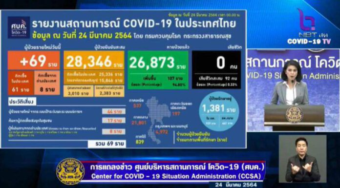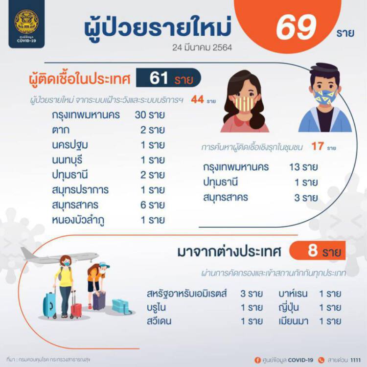 วันที่ 24 มี.ค.64 เวลา 11.30 น. ที่ ทำเนียบรัฐบาล พญ.อภิสมัย ศรีรังสรรค์ ผช.โฆษกศูนย์บริหารสถานการณ์โควิด-19 รายงานสถานการณ์การแพร่ระบาดของไวรัสโควิด-19 วันนี้ ว่า พบผู้ป่วยยืนยันติดเชื้อรายใหม่เพิ่ม 69 ราย ติดเชื้อภายในประเทศ 61 ราย มาจากการตรวจในระบบเฝ้าระวังและบริการ 44 ราย จากการค้นหาคัดกรองเชิงรุกในชุมชน 17 ราย และผู้ที่เดินทางมาจากต่างประเทศ โดยอยู่ในสถานกักกันที่รัฐจัดให้ (State Quarantine) 8 ราย สหรัฐอาหรับเอมิเรตส์ 1 ราย บรูไน 1 ราย สวีเดน 1 ราย บาห์เรน 1 ราย ญี่ปุ่น 1 ราย เมียนมา 1 ราย ส่วนผู้ป่วยมีการรักษาหายเพิ่ม 107 ราย