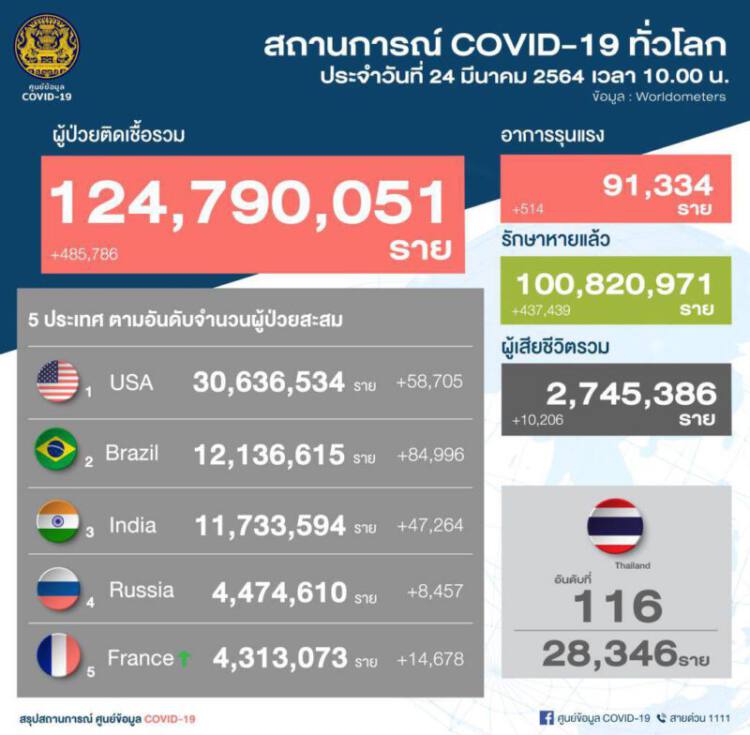 สถานการณ์โรคติดเชื้อไวรัสโคโรนา 2019 (COVID-19) ทั่วโลก วันพุธที่ 24 มีนาคม 2564 เวลา 10.00 น. ยอดผู้ติดเชื้อรวม 124,790,051 ราย อาการรุนแรง 91,334 ราย รักษาหายแล้ว 100,820,971 ราย เสียชีวิต 2,745,386 ราย