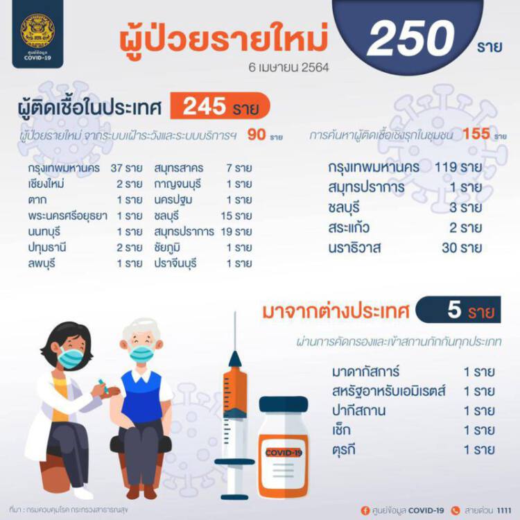วันที่ 6 เม.ย.64 ศูนย์บริหารสถานการณ์โควิด-19 (ศบค.) รายงานสถานการณ์การแพร่ระบาดของไวรัสโควิด-19 ในประเทศวันนี้ ว่า พบผู้ป่วยยืนยันติดเชื้อรายใหม่เพิ่ม 250 ราย เป็นผู้ติดเชื้อภายในประเทศ 245 ราย มาจากการตรวจในระบบเฝ้าระวังและบริการ 90 ราย จากการค้นหาคัดกรองเชิงรุกในชุมชน 155 ราย และผู้ที่เดินทางมาจากต่างประเทศ โดยอยู่ในสถานกักกันที่รัฐจัดให้ (State Quarantine) 5 ราย ส่วนผู้ป่วยมีการรักษาหายเพิ่ม 108 ราย ไม่มีรายงานผู้เสียชีวิตเพิ่ม