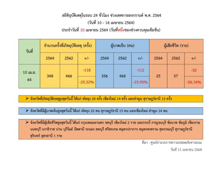 วันที่ 11 เม.ย.64 นายนิพนธ์ บุญญามณี รัฐมนตรีช่วยว่าการกระทรวงมหาดไทย กล่าวถึงวันแรกของการรณรงค์ “สงกรานต์สุขใจ ขับขี่ปลอดภัย ห่างไกลโควิด” พบว่า เกิดอุบัติเหตุ 348 ครั้ง เสียชีวิต 25 ราย บาดเจ็บ 356 คน โดยสาเหตุที่ทำให้เกิดอุบัติเหตุสูงสุด คือ ขับรถเร็ว ร้อยละ 31.61 ดื่มแอลกอฮอล์แล้วขับ ร้อยละ 22.99 ยานพาหนะที่เกิดอุบัติเหตุสูงสุด คือ รถจักรยานยนต์ ร้อยละ 82.91 ส่วนใหญ่เกิดบนเส้นทางตรง ร้อยละ 63.22 ถนนกรมทางหลวง ร้อยละ 39.94 ถนนใน อบต./หมู่บ้าน ร้อยละ 33.91 มีผู้บาดเจ็บและเสียชีวิตสูงสุด อยู่ในช่วงอายุ 50 ปีขึ้นไป ร้อยละ 32.81