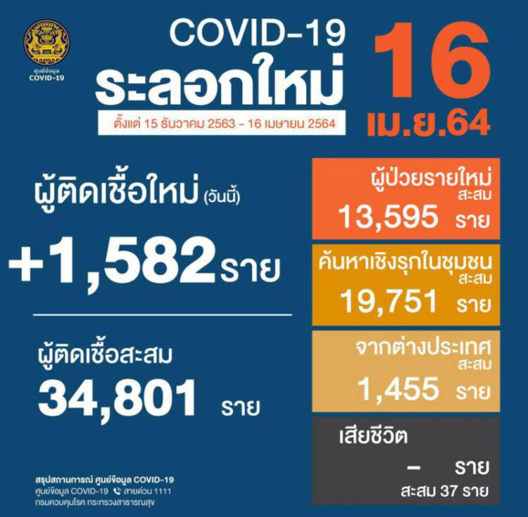 วันที่ 16 เม.ย.64 เวลา 11.30 น. ที่กระทรวงสาธารณสุข นพ.เฉวตสรร นามวาท รักษาราชการแทนผู้อำนวยการกองควบคุมโรคและภัยสุขภาพในภาวะฉุกเฉิน กรมควบคุมโรค รายงานสถานการณ์การแพร่ระบาดของไวรัสโควิด-19 ในประเทศวันนี้ ว่า พบผู้ป่วยยืนยันติดเชื้อรายใหม่เพิ่ม 1,582 ราย เป็นผู้ติดเชื้อภายในประเทศ 1,577 ราย มาจากการตรวจในระบบเฝ้าระวังและบริการ 921 ราย จากการค้นหาคัดกรองเชิงรุกในชุมชน 656 ราย และผู้ที่เดินทางมาจากต่างประเทศ โดยอยู่ในสถานกักกันที่รัฐจัดให้ (State Quarantine) 5 ราย ส่วนผู้ป่วยมีการรักษาหายเพิ่ม 97 ราย ไม่มีรายงานผู้เสียชีวิตเพิ่ม