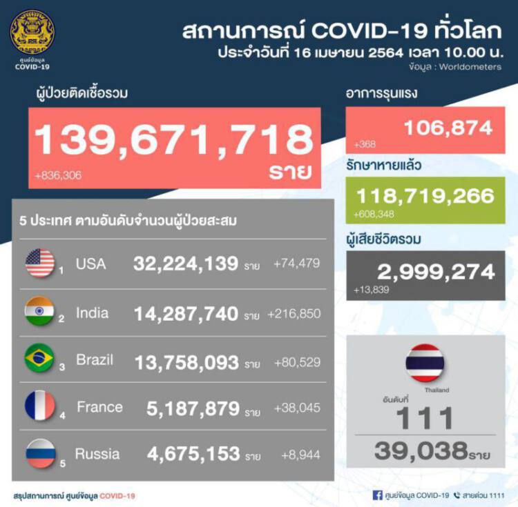 สถานการณ์โรคติดเชื้อไวรัสโคโรนา 2019 (COVID-19) ทั่วโลก วันศุกร์ที่ 16 เมษายน 2564 เวลา 10.00 น. ยอดผู้ติดเชื้อรวม 139,671,718 ราย อาการรุนแรง 106,874 ราย รักษาหายแล้ว 118,719,266 ราย เสียชีวิต 2,999,274 ราย