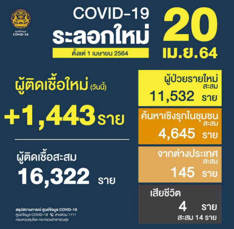 วันที่ 20 เม.ย.2564 เวลา 11.30 น. นพ.ทวีศิลป์ วิษณุโยธิน โฆษกศูนย์บริหารสถานการณ์โควิด-19 รายงานสถานการณ์การแพร่ระบาดของไวรัสโควิด-19 พบผู้ป่วยติดเชื้อรายใหม่เพิ่ม 1,443 ราย เป็นการติดเชื้อในประเทศ 1,441 ราย มาจากการตรวจในระบบเฝ้าระวังและบริการ 1,328 ราย จากการค้นหาคัดกรองเชิงรุกในชุมชน 113 ราย และมาจากต่างประเทศ โดยอยู่ในสถานกักกันที่รัฐจัดให้ (State Quarantine) 2 ราย เดนมาร์ก 1 ราย อินเดีย 1 ราย ส่วนผู้ป่วยรักษาหายเพิ่ม 171 ราย เสียชีวิตเพิ่ม 4 ราย มีผู้ป่วยอาการหนัก 223 ราย และผู้ป่วยที่ใส่เครื่องช่วยหายใจ 55 ราย
