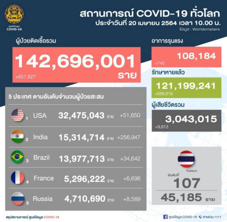 สถานการณ์โรคติดเชื้อไวรัสโคโรนา 2019 (COVID-19) ทั่วโลก วันอังคารที่ 20 เมษายน 2564 เวลา 10.00 น. ยอดผู้ติดเชื้อรวม 142,696,001 ราย อาการรุนแรง 108,184 ราย รักษาหายแล้ว 121,199,241 ราย เสียชีวิต 3,043,015 ราย