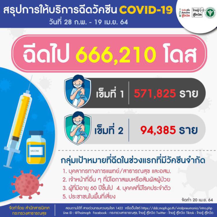 รักษาหายเพิ่ม 171 ราย เสียชีวิตเพิ่ม 4 ราย ทำให้ระลอกใหม่ตั้งแต่วันที่ 1 เมษายน 2564 มีผู้ติดเชื้อสะสม 16,322 ราย รักษาหายแล้ว 1,532 ราย กำลังรักษา 16,119 ราย และเสียชีวิตสะสม 14 ราย ขณะที่การฉีดวัคซีนโควิด-19 ตั้งแต่วันที่ 28 กุมภาพันธ์ – 19 เมษายน 2564 ฉีดสะสม 666,210 โดส เป็นเข็มที่ 1 จำนวน 571,825 ราย เข็มที่สองรวม 94,385 ราย