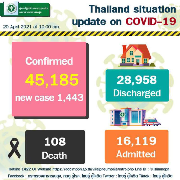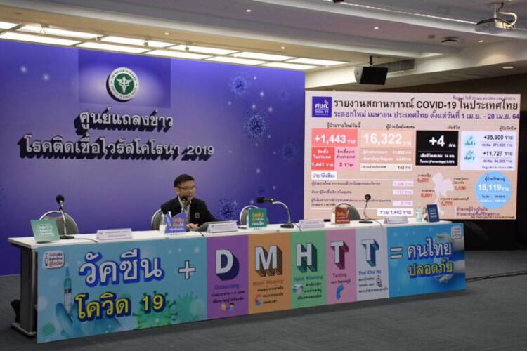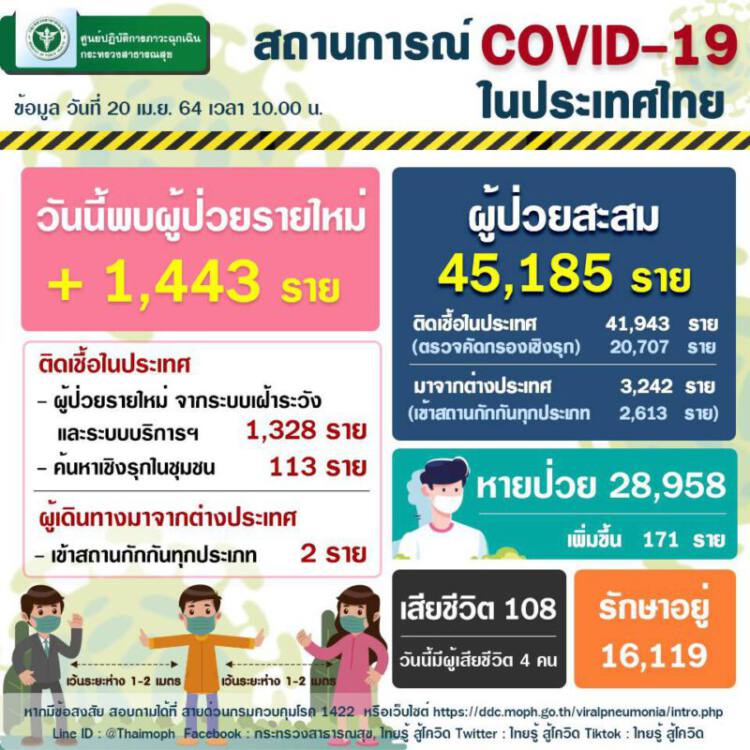 วันที่ 20 เม.ย.64 ที่ ศูนย์แถลงข่าวสถานการณ์โรคติดเชื้อไวรัสโคโรนา 2019 กระทรวงสาธารณสุข จ.นนทบุรี นายแพทย์เฉวตสรร นามวาท รักษาราชการแทนผู้อำนวยการกองควบคุมโรค และภัยสุขภาพในภาวะฉุกเฉิน กรมควบคุมโรค แถลงสถานการณ์โรคโควิด-19 ว่า วันนี้ประเทศไทยมีผู้ติดเชื้อรายใหม่ 1,443 ราย มาจากระบบเฝ้าระวังในโรงพยาบาล 1,328 ราย คัดกรองเชิงรุกในชุมชน 113 ราย และเดินทางมาจากต่างประเทศ 2 ราย
