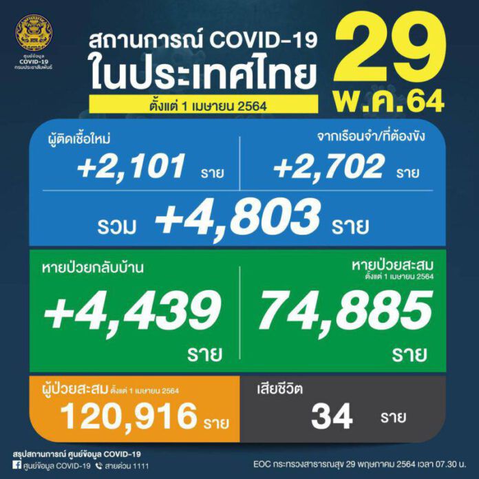 วันที่ 29 พ.ค.2564 เวลา 07.30 น. ศูนย์ข้อมูลโควิด-19 รายงานตัวเลขผู้ติดเชื้อโควิด-19 สะสมของประเทศไทย ประจำวันที่ 29 พฤษภาคม 2564 ดังนี้ พบจํานวนผู้ติดเชื้อโควิด-19 รายใหม่เพิ่มขึ้น 4,803 ราย แบ่งออกเป็นติดเชื้อใหม่ 2,101 ราย จากเรือนจำ-ที่ต้องขัง 2,702 ราย ทำให้จำนวนผู้ติดเชื้อสะสม 149,779 ราย มีผู้เสียชีวิตเพิ่ม 34 คน ยอดสะสม 988 คน