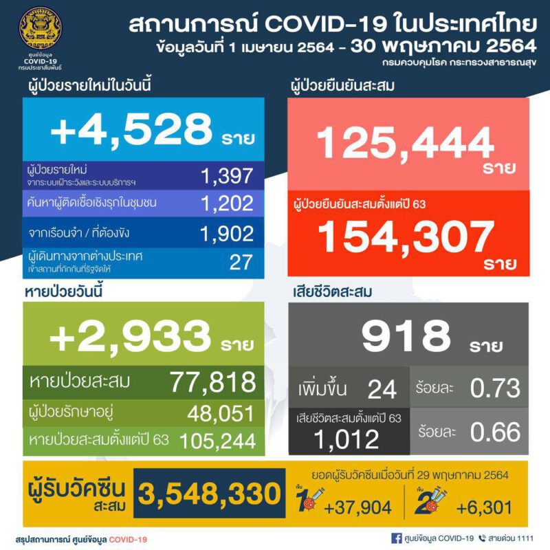วันที่ 30 พ.ค.2564 เวลา 12.30 น.ที่ทำเนียบรัฐบาล พญ.อภิสมัย ศรีรังสรรค์ ผู้ช่วยโฆษกศูนย์บริหารสถานการณ์การแพร่ระบาดของโรคติดเชื้อไวรัสโคโรนา 2019 (โควิด-19) หรือ ศบค. แถลงสถานการณ์ประจำวัน พบผู้ติดเชื้อรายใหม่ 4,528 ราย โดยแบ่งเป็นผู้ป่วยจากระบบเฝ้าระวังและระบบบริการฯ 1,397 ราย ค้นหาผู้ติดเชื้อเชิงรุกในชุมชน 1,202 ราย จากเรือนจำ/ที่ต้องขัง 1,902 ราย ผู้เดินทางจากต่างประเทศ เข้าสถานกักกันที่รัฐจัดให้ 27 ราย พบผู้ป่วยยืนยันสะสมระลอกเมษายน 125,444 ราย รวมผู้ป่วยยืนยันสะสมตั้งแต่ปี 2563 154,307 ราย
