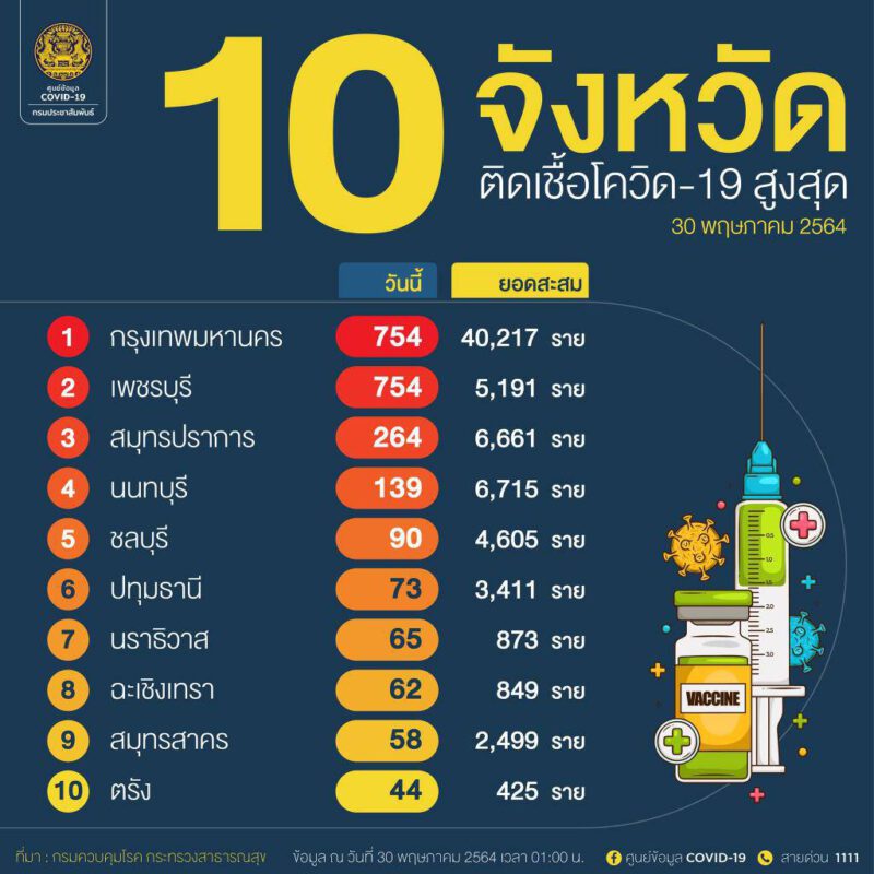 10 จังหวัด ติดเชื้อโควิด-19 ในประเทศ วันที่ 30 พ.ค. 2564 คือ 1. กรุงเทพมหานคร 754 ราย 2. เพชรบุรี 754 ราย ราย 3. สมุทรปราการ 264 ราย 4. นนทบุรี 139 ราย 5. ชลบุรี 90 ราย 6. ปทุมธานี 73 ราย 7. นราธิวาส 65 ราย 8. ฉะเชิงเทรา 62 ราย 9. สมุทรสาคร 58 ราย 10. ตรัง 44 ราย