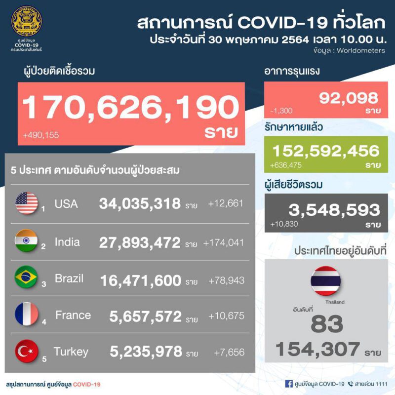 สถานการณ์โรคติดเชื้อไวรัสโคโรนา 2019 (COVID-19) ทั่วโลก ยอดผู้ติดเชื้อรวม 170,626,190 ราย อาการรุนแรง 92,098 ราย รักษาหายแล้ว 152,592,456 ราย เสียชีวิต 3,548,593 ราย