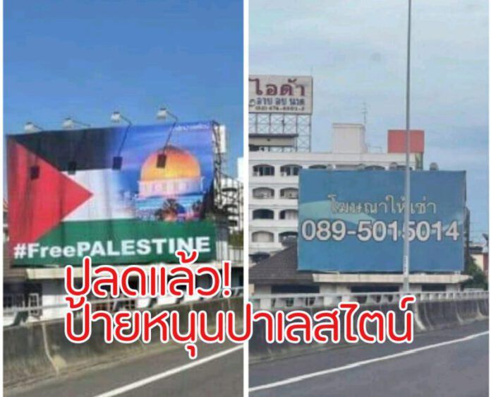 เมื่อไม่กี่วันที่ผ่านมา มีกระแสข่าวรายงานว่ามีการซื้อป้ายโฆษณาขนาดใหญ่สนับสนุนปาเลสไตน์บริเวณทางด่วน ย่านทางลงถนนสาธุประดิฐษ์ ในป้ายปรากฏธงชาติปาเลสไตน์และข้อความภาษาอังกฤษ “Free Palestine” โดยถือเป็นครั้งแรกและเป็นรูปแบบใหม่ของการแสดงออกถึงการสนับสนุนปาเลสไตน์ในประเทศไทย ซึ่งในรายละเอียดไม่ปรากฏชัดเจนว่าเป็นของใคร แต่สันนิฐานว่าเป็นของมุสลิมไทยที่ต้องการแสดงออกอย่างสันติในรูปแบบเดียวกับที่เกิดในยุโรปซึ่งทำกันเป็นปกติ อย่างไรก็ตาม มีข่าวออกมาว่าป้านดังกล่าวถูกปลดลงอันเนื่องมาจากถูกแรงกดดันจากภาครัฐ (แต่ยังไม่มีการยืนยันใด ๆ ทั้งสิ้น) อันนำไปสู่การตั้งคำถามมากมาย