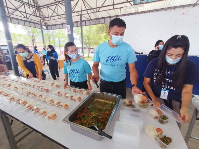 วันที่ 7 มิ.ย.2564 มหาวิทยาลัยสงขลานครินทร์ วิทยาเขตปัตตานี โดยฝ่าย ศิษย์เก่าสัมพันธ์และกิจการพิเศษ วิทยาเขตปัตตานี เปิดโรงครัวปันสุข “ม.อ.ปัตตานี ส่งกำลังใจให้ทีมแพทย์และพยาบาล” โดยมีบุคลากรมหาวิทยาลัย ผู้จำหน่ายอาหารโรงอาหารมหาวิทยาลัย ร่วมประกอบอาหารกลางวันให้ทีมแพทย์ พยาบาล อสม. และเจ้าหน้าที่ ที่อำนวยความสะดวกในการฉีดวัคซีน โดยมี เมนูปลากะพงผัดเครื่องแกง และข้าวเนื้อทอดกระเทียมพริกไทย ส่งมอบให้กับศูนย์ฉีดวัคซีน ที่ อาคาร 58 มหาวิทยาลัยสงขลานครินทร์ วิทยาเขตปัตตานี จำนวน 250 ชุดโดยมีอาจารย์นวมน จันทร์กลิ่น ผู้ช่วยอธิการบดีฝ่ายศิษย์เก่าสัมพันธ์และกิจการพิเศษ วิทยาเขตปัตตานี เป็นผู้ส่งมอบ และนายแพทย์ชัยรัตน์ ลำโป นายแพทย์สาธารณสุขจังหวัด เป็นผู้รับมอบและในวันเวลาเดียวกัน รศ.อิ่มจิต เลิศพงษ์สมบัติ รองอธิการบดีวิทยาเขตปัตตานี ได้ส่งมอบอาหารกลางวันให้แก่ทีมแพทย์ พยาบาล อสม. และเจ้าหน้าที่ที่อำนวยความสะดวกในการฉีดวัคซีน ประจำศูนย์โรงพยาบาลสนาม หอประชุมองค์การบริหารส่วนจังหวัดปัตตานี จำนวน 150 ชุด โดยมีนายแพทย์อรุณ ประเสริฐสุข รองผู้อำนวยการโรงพยาบาลปัตตานี เป็นผู้รับมอบ