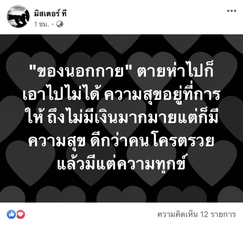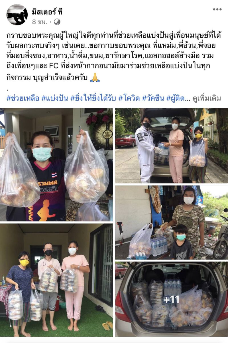 คุณที ไม่ใช่นักการเมืองท้องถิ่น ไม่ใช่คนรวย แต่ตั้งใจ ช่วยเหลือคนที่ป่วยด้วยโรคโควิด ในพื้นที่ชุมชนแออัด ย่านฝั่งธน หาเตียง ส่งข้าว ส่งน้ำ ส่งยา ลูกเด็กเล็กแดง ไม่เกี่ยงว่า จะนับถือศาสนาอะไร ทุกคนในวินาทีนี้ เวลานี้ ทุกคนคือคนสำคัญที่ พี่ที พยายามจะรักษาชีวิต คนที่รัฐบาลหันหลังให้อย่างเต็มความสามารถ ทำเต็มที่ ทุ่มสุดตัว ระบาดระลอก 1 ครั้ง 2 ครั้ง 3 จนมาหนักสุดระบาด ระลอก 4 พี่ที ถึงขั้นปล่อยรถ ที่ตนใช้ในการขนถ่ายข้าวของ น้ำ อาหาร ยา และไปรับไปส่งผู้ป่วย ญาติผู้ป่วย ค่าน้ำมัน เงินตัวเอง ค่าแรง ได้รอยยิ้ม กับคำว่าขอบคุณนะ จากผู้ป่วย ญาติผู้ป่วยที่หาย เป็นแรงผลักดันแกมีแรงทำดีต่อไป แม้ เพื่อน ญาติ พี่น้อง ต่างบอกเอาเท่าที่ไหว เราไม่จำเป็นต้องลงทุน รถก็ไป ของมีค่าก็ไป แต่ด้วยความตั้งใจดี ทำดี และทนเห็นคนตายในบ้าน คาบ้าน ริมถนนไม่ได้ มันทำให้แกเดินต่อไป แม้วันนี้ จะไม่มีรถจะขับแล้ว น้อยคนที่เราจะเจอคนแบบนี้ ปิดทองหลังพระ ทองเนื้อแท้ คนดีของชุมชนย่านฝั่งธน ฝั่งปริมณฑล