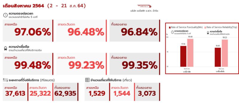 นายศักดิ์สยาม ชิดชอบ รมว.คมนาคม เป็นประธานประชุมคณะกรรมการเตรียมการเปิดให้บริการ และ การบริหารโครงการระบบรถไฟชานเมือง (สายสีแดง) และ สถานีกลางบางซื่อ เพื่อติดตามความคืบหน้า ผลการดำเนินงานการเตรียมความพร้อมในด้านต่าง ๆ ผ่านการประชุมทางไกล เมื่อ เวลา 15.00 น. วันที่ 26 ส.ค.ที่ผ่านมา โดยมีนายชยธรรม์ พรหมศร ปลัดกระทรวงคมนาคม , นายสรพงศ์ ไพฑูรย์พงษ์ รองปลัดกระทรวงคมนาคม, นายอานนท์ เหลืองบริบูรณ์ รองปลัดกระทรวงคมนาคม, นายกิตติพันธ์ ปานจันทร์ อธิบดีกรมการขนส่งทางราง, นางจันทิรา บุรุษพัฒน์ ผู้ตรวจราชการกระทรวงคมนาคม, นายจิรุตม์ วิศาลจิตร อธิบดีกรมการขนส่งทางบกและประธานกรรมการการรถไฟแห่งประเทศไทย , นายนิรุฒ มณีพันธ์ ผู้ว่าการรถไฟแห่งประเทศไทย, นายปัญญา ชูพานิช ผู้อำนวยการสำนักงานนโยบายและแผนการขนส่งและจราจร ผู้แทนกระทรวงการคลัง ผู้แทนสำนักงบประมาณ หัวหน้าหน่วยงานและผู้บริหารหน่วยงานในสังกัดกระทรวงคมนาคมที่เกี่ยวข้องเข้าร่วมประชุมนายศักดิ์สยามฯ กล่าวว่า การรถไฟแห่งประเทศไทย ได้เปิดให้บริการโครงการระบบรถไฟชานเมือง (สายสีแดง) แบบเสมือนจริง มาตั้งแต่วันที่ 2 ส.ค. 2564 โดยไม่คิดค่าโดยสาร ปัจจุบันมีผู้โดยสารเฉลี่ยประมาณวันละ 3,073 คน ซึ่ง เป็นผลกระทบมาจากสถานการณ์การแพร่ระบาดของไวรัสโคโรนา 2019 และ นโยบายของรัฐบาลที่ให้ประชาชนงดการเดินทางหากไม่จำเป็น อย่างไรก็ตาม หากพิจารณาความตรงต่อเวลา และความน่าเชื่อถือในการให้บริการ พบว่าอยู่ที่ร้อยละ 96.84 และ 99.35 ตามลำดับ ซึ่งอยู่ในระดับการให้บริการเป็นที่น่าพอใจ และได้ติดตามความก้าวหน้าการดำเนินการในด้านต่างๆ ดังนี้