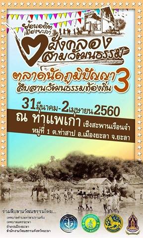 ภายในงานยังมุ่งเน้นด้วยการนำเสนอภูมิปัญญาท้องถิ่น ประเพณีวัฒนธรรมที่เข้มแข็ง ผสมผสานด้วยประวัติศาสตร์ ศิลปะ และภูมิปัญญาท้องถิ่น ที่สำคัญยกตลาดนัดมาไว้ในงานเดียวกัน ซึ่งการจัดงานในครั้งนี้ ภายใต้กรอบแนวคิด “ย้อนอดีตเมืองยะลา 2 ฝั่งคลองสามวัฒนธรรม” เพื่อส่งเสริมการอยู่ร่วม ความรักความสามัคคี ความสัมพันธ์ที่ดีระหว่างพี่น้องมุสลิม พี่น้องชาวไทยพุทธ และพี่น้องชาวไทยเชื้อสายจีน ทีมีสายน้ำ 2 ฝั่งคลองเมื่อครั้งอดีตเป็นตัวเชื่อม ภายใต้พหุวัฒนธรรมที่มีมาอย่างช้านาน และนอกจากเพิ่มความสัมพันธ์ที่ดีแล้ว ยังเป็นการสืบสานให้เยาวชนรุ่นหลังได้ตระหนักรู้รักสามัคคีของการอยู่ร่วมกัน ที่สำคัญยังเป็นการกระตุ้นเศรษฐกิจให้กับพี่น้องประชาชนในพื้นที่อีกด้วย