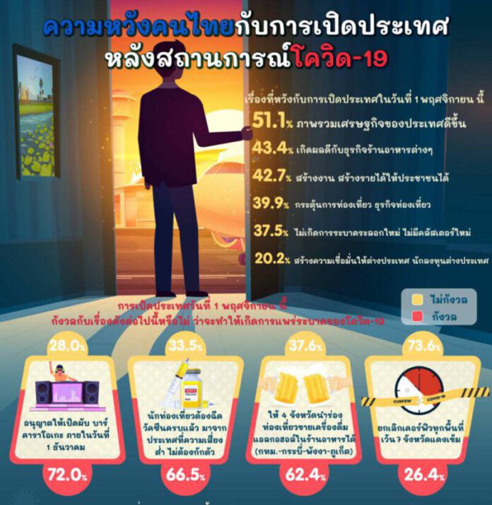 “กรุงเทพโพล” เผย ประชาชนส่วนใหญ่ ร้อยละ72 กังวลโควิดระบาดหลังเปิดประเทศ ห่วงเปิดผับ บาร์ คาราโอเกะนักท่องเที่ยวไม่กักตัว เป็นเหตุแพร่ระบาด แต่ยังหวังเศรษฐกิจดีขึ้น-สร้างงานสร้างรายได้