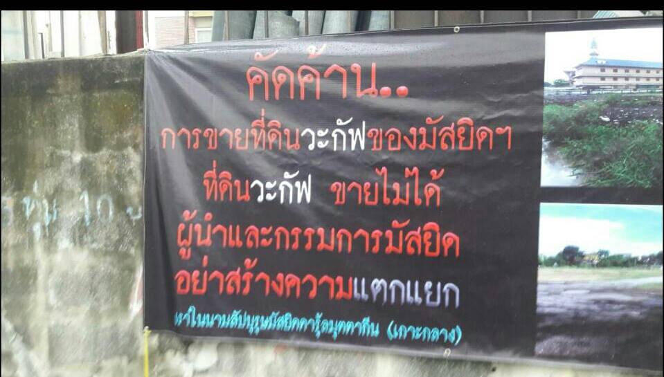 วันที่ 2 เมษายน ตามที่คณะกรรมการมัสยิดมัสยิดดารุ้ลมุตตากีน (เกาะกลาง) อ่อนนุช 53 ประเวศ กทม. เห็นชอบที่จะนำที่ดินวากั๊ฟขอองมัสยิดปขายได้รับการคัดค้านจากสัปบุรุษและผู้ซื้อที่ดินบริจาค มีการติดป้ายคัดค้านการขานที่ดินดังกล่าว และมีการนัดหมายที่จะทำความเข้าใจกันในเวลา 13.00 น. วันนี้