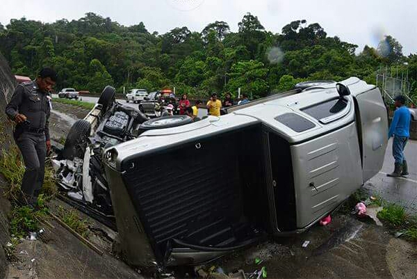 วันนี้ (3 เม.ย.) ร.ต.อ.มานพ สุวรรณมณี ร้อยเวร สภ.ศรีนครินทร์ จ.พัทลุง รับแจ้งเกิดอุบัติเหตุรถตกข้างทางมีผู้ได้รับบาดเจ็บหลายรายที่เขาพับผ้า เขตรอยต่อจังหวัดพัทลุง-ตรัง หมู่ที่ 1 ต.บ้านนา อ.ศรีนครินทร์ จ.พัทลุง จึงเดินทางไปสอบสวนพร้อมกับหน่วยกู้ภัยศรีนครินทร์และหน่วยกู้ชีพ โรงพยาบาลศรีนครินทร์ ในที่เกิดเหตุห่างจากศาลาทวดเขาพับผ้า ซึ่งเป็นจุดแบ่งเขตระหว่างจังหวัดพัทลุง-ตรัง พบรถยนต์โตโยต้าฟอร์จูนเนอร์ สีขาวคันใหม่เอี่ยม ไม่ติดแผ่นป้ายทะเบียน พลิกหงายท้องอยู่ริมถนน และในที่เดียวกันพบรถยนต์โตโยต้าแค็บ สีบรอนเงิน หมายเลขทะเบียน บน.2335 ตรัง พลิกหงายท้องอยู่อีก 1 คัน ในที่เกิดเหตุมีผู้ได้รับบาดเจ็บ จำนวน 3 คน หน่วยกู้ภัยได้ช่วยกันนำส่งโรงพยาบาลนาโยง อ.นาโยง จ.ตรัง