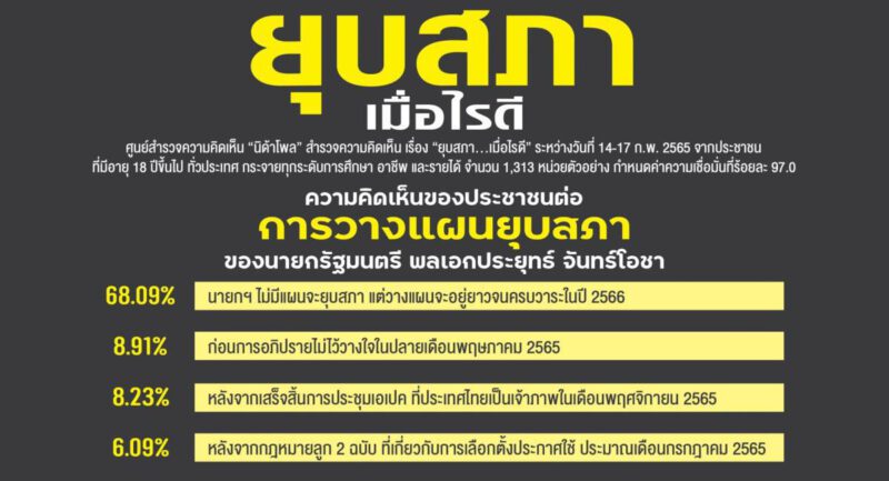 วันที่ 20 ก.พ.2565 ศูนย์สำรวจความคิดเห็น “นิด้าโพล” สถาบันบัณฑิตพัฒนบริหารศาสตร์ (นิด้า) เปิดเผยผลสำรวจของประชาชน เรื่อง “ยุบสภา…เมื่อไรดี” โดยทำการสำรวจระหว่างวันที่ 14-17 ก.พ. 2565 จากประชาชนที่มีอายุ 18 ปีขึ้นไป กระจายทุกภูมิภาค ระดับการศึกษา อาชีพ ทั่วประเทศ รวมจำนวน 1,313 หน่วยตัวอย่าง เกี่ยวกับการยุบสภาของนายกรัฐมนตรี พลเอกประยุทธ์ จันทร์โอชาเมื่อถามถึงความคิดเห็นของประชาชนต่อการวางแผนยุบสภา พบว่า ตัวอย่าง ร้อยละ 68.09 ระบุว่า นายกฯ ไม่มีแผนจะยุบสภา แต่วางแผนจะอยู่ยาวจนครบวาระในปี 2566 รองลงมา ร้อยละ 8.91 ระบุว่า ก่อนการอภิปรายไม่ไว้วางใจในปลายเดือนพฤษภาคม 2565 ร้อยละ 8.23 ระบุว่า หลังจากเสร็จสิ้นการประชุมเอเปค ที่ประเทศไทยเป็นเจ้าภาพ ในเดือนพฤศจิกายน 2565 ร้อยละ 6.09 ระบุว่า หลังจากกฎหมายลูก 2 ฉบับ ที่เกี่ยวกับการเลือกตั้งประกาศใช้ ประมาณเดือนกรกฎาคม 2565 ร้อยละ 4.95 ระบุว่า หลังจากร่าง พ.ร.บ. งบประมาณ ผ่านความเห็นชอบจากสภาประมาณเดือนสิงหาคม 2565 และร้อยละ 3.73 ระบุว่าเฉย ๆ/ไม่ตอบ/ไม่สนใจ