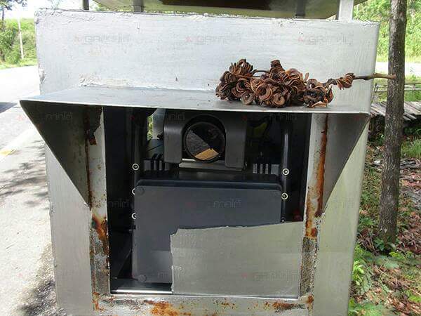 โดยพบว่าคนร้ายได้ใช้ไม้ตีเข้าที่กระจกพลาสติกของตู้กล้องตรวจจับความเร็วจนแตก และบริเวณจุดเกิดเหตุพบไม้มีความยาวประมาณ 1 เมตร ตกอยู่ และเศษชิ้นส่วนของกระจกพลาสติกที่แตกเสียหาย รวมทั้งร่องรอยของรถยนต์ที่มาจอดด้านหลังกล้องตรวจจับความเร็ว ซึ่งมีคราบน้ำมันเครื่องอยู่บนถนน ซึ่งคาดว่าน่าจะเป็นรถของผู้ที่ก่อเหตุที่ลงมือในช่วงเวลากลางคืน อย่างไรก็ตาม ยังโชคดีที่กล้องตรวจจับความเร็วไม่ได้รับความเสียหาย เนื่องจากในช่วงกลางคืนเจ้าหน้าที่จะเก็บกลับไป