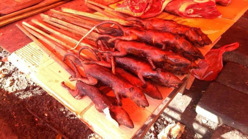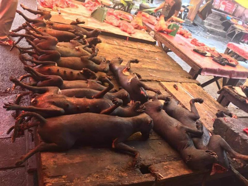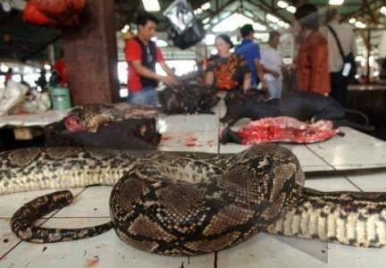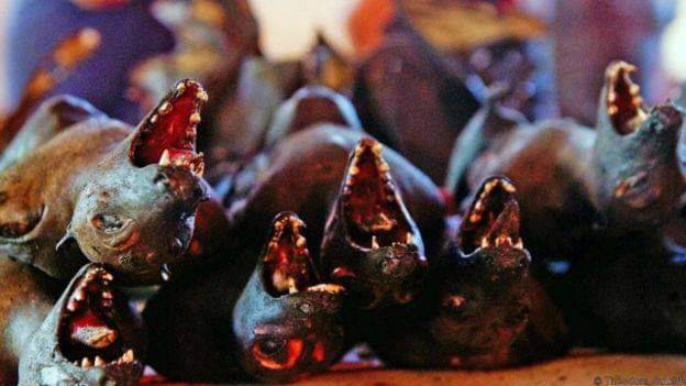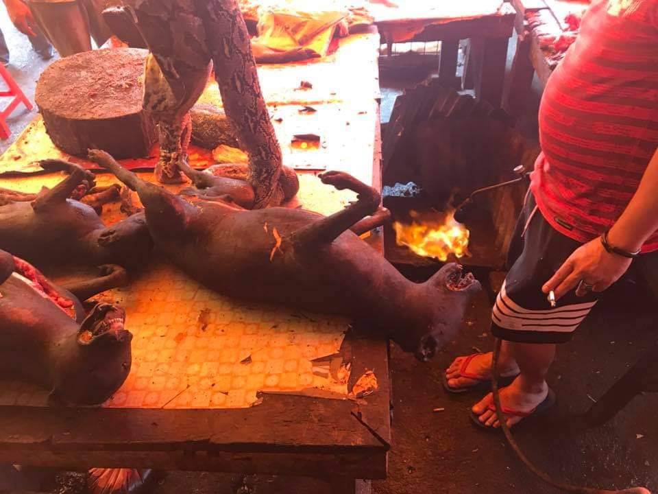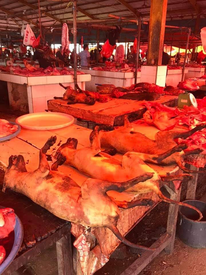 ซากสัตว์ป่าหลากหลายชนิด ถูกนำมาวางกองเรียงรายอยู่บนแผงดูละลานตาไปหมด มีทั้ง สุนัข ลิงป่าหลากหลายสายพันธุ์ ค้างคาวแม่ไก่และหมูป่าที่ถูกทำความสะอาดและเผาขนเรียบร้อย วางนอนเรียงรายแสยะยิ้มเห็นฟันขาวและเขี้ยวยาว งูเหลือมก็ถูกสับเป็นท่อนๆ วางไว้อย่างเป็นระเบียบ สัตว์ป่าหลากหลายชนิดที่มีจำหน่ายที่ตลาดแห่งนี้ มีทั้งแบบที่ยังมีชีวิตที่รอให้คุณเข้าไปเลือกชมเลือกซื้อและมีแบบที่ตายแล้วและทางร้านมีบริการเผาขน ลอกหนังและสับเป็นชิ้นๆ ให้เรียบร้อย หรือถ้าคุณต้องการเลือดสดๆ หรือ อวัยวะพิเศษบางส่วน เช่น ดี ตับ สมอง ทางร้านก็มีบริการ