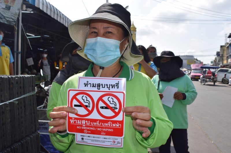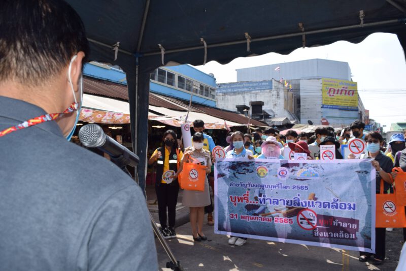 วันที่ 31 พ.ค.2565 ที่บริเวณตลาดสดเทศบาลเมืองสุรินทร์ นาย ธนากร วนะกิจกุลพัฒน์ รองนายกเทศมนตรีเมืองสุรินทร์พร้อมคณะร่วมกับเครือข่ายมูลนิธิรณรงค์เพื่อการไม่สูบบุหรี่และสื่อมวลชน กิจกรรมวันงดสูบบุหรี่โลก ปี 2565 เดินรณรงค์ชวนเชิญแจกสติกเกอร์ ให้ประชาชนเลิกสูบบุหรี่ เดินรณรงค์-ไปตาม“จุดจอดรถผู้โดยสารปลอดบุหรี่”ในครั้งนี้ สืบเนื่องจาก จุดดังกล่าวมีเยาวชนและประชาชนใช้บริการ เป็นจุดพักคอยในการเดินทางโดยรถสาธารณะจำนวนมาก ประกอบด้วย รถโดยสารสาธารณะ รถมอเตอร์ไซด์รับจ้าง รถตุ๊กๆ เป็นต้น ซึ่งพื้นที่ดังกล่าวนับได้ว่าเป็นพื้นที่สาธารณะ และมีการร้องเรียนอยู่บ่อยครั้ง ถึงเรื่องการสูบบุหรี่ในที่สาธารณะ ดังนั้นภาคีเครือข่ายร่วมรณรงค์ปลอดบุหรี่ จ.สุรินทร์ จึงอยากเห็นพื้นที่ดังกล่าวเป็นพื้นที่ปลอดบุหรี่ 100% และเมื่อโครงการดังกล่าวแล้วเสร็จจะทำให้จุดจอดรับ-ส่งผู้โดยสารเป็นพื้นที่ปลอดบุหรี่ 100% ซึ่งเป็นอีกหนึ่งเหตุผลที่จะทำให้คนเลิกสูบบุหรี่